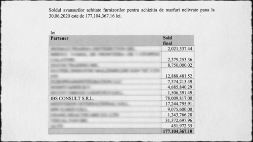 Într-un raport semestrial al Unifarm, firma IBS Consult figurează cu cea mai mare sumă primită avans pentru marfă care n-a mai fost livrată ulterior: 78 de milioane de lei! În total, Unifarmul condus de Adrian Ionel a plătit 177 de milioane de lei în avans pentru diverse contracte care n-au mai fost onorate.