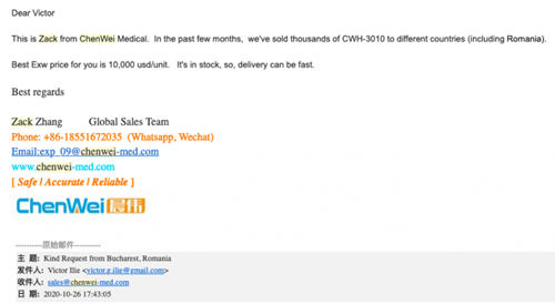 Reporterii Recorder au luat legătura cu furnizorii din China și aceleași ventilatoare le-au fost oferite la prețul de 10.000 de dolari (8.500 de euro). I-au întrebat pe chinezi cât costau în aprilie, când prețurile crescuseră, și aceştia au mărturisit că le vindeau cu 18.000 de dolari.