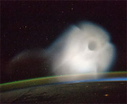 În timp ce specialiștii de la Centru analizau aceste informații uluitoare, Saliut 7 a pătruns în nor. Echipajul a devenit conștient de faptul că norul portocaliu a intrat în nava lor, învăluindu-i și îmbrățișându-i pe cosmonauți, care au rămas atât de uluiți și aproape orbiți de această strălucire divină, încât niciunul dintre ei nu mai era conștient de prezența celorlalți colegi. Totuși, vederea așa-zis normală le-a revenit foarte repede. Astronauții s-au repezit să privească prin hublourile navetei.
