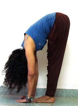 PADAHASTASANA sau postura mâinilor la picioare. Având tălpile paralele și ușor depărtate ne aplecăm în față cât mai mult încercând să atingem degetele de la picioare cu mâinile, urmărind să ținem genunchii cât mai întinși. Începem să elasticizăm coloana cât mai mult, dacă nu ajungem la degetele de la picioare este suficient să lăsăm brațele grele la sol. La revenire derulăm coloana cât mai ușor, capul fiind ultimul care se ridică.