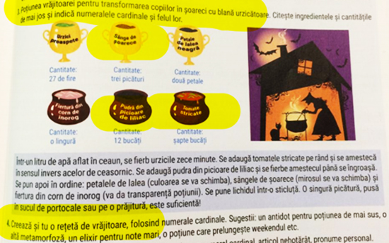 Un manual de limba și literatura română de clasa a V-a conține un exercițiu în care copiilor le este prezentată o vrăjitoare care prepară o poțiune ce „transformă copiii în șoareci cu blană urzicătoare”.