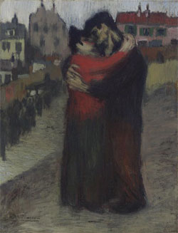 Una dintre primele scene pe care el le-a pictat după venirea în Paris, în 1900, reprezintă un bărbat şi o femeie îmbrăţişându-se pudic în Amanţi pe stradă – pastel şi pictură, iar în alta îmbrăţişându-se pasional în Îmbrăţişarea, care are drept cadru o cameră unde femeia este pe jumătate dezbrăcată. În aceste diferite versiuni ale unei teme care se repetă se simte influenţa pictorului Toulouse Lautrec. Femeia lui Picasso din acea perioadă a tinereţii sale pariziene este „cea care aduce bucuria” şi provine de la periferie ori de la balurile de societate, fiind reprezentată în numeroase pânze sau pasteluri, în diverse ipostaze.