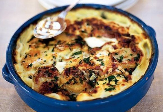 Tocați verdeaţa, curățaţi şi tocați ceapa şi tăiați rondele cartofii şi ţelina. Încălziți uleiul într-o tigaie şi sotați ceapa cu o parte din verdeaţa tocată, până se înmoaie. Tăiați usturoiul în două şi frecați cu el o tavă termorezistentă, aşezați un strat de cartofi în vas, apoi ceapa (plus verdeaţă) şi ţelina, și condimentați cu sare şi piper după gust. Turnați supa de legume şi puneți câteva linguri de unt, apoi acoperiți cu un capac şi dați tava la cuptor 45 de minute.