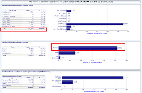 Am mers și noi, așa cum ne-a recomandat ANM, pe site-ul de Rapoarte al EMA. La vaccinul experimental Pfizer/BioNTech – Comirnaty am găsit până la data de 29 ianuarie 2021 înregistrate un număr de 26.849 de reacții adverse raportate, majoritatea la persoane între 18 și 64 de ani, dintre care PESTE 20.000, FEMEI (atenție, românce!).