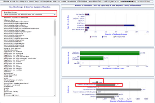 Informații privind reacțiile adverse raportate la nivel european pentru toate medicamentele, inclusiv pentru vaccinurile COVID-19, sunt disponibile pe website-ul pus la dispoziție de Agenția Europeană pentru Medicamente (www.adrreports.eu ). Se va selecta limba română, după aceea se accesează secțiunea „Caută un raport” cu posibilitatea de căutare rapoarte reacții adverse pentru substanța activă respectivă, (ex. Covid-19 MRNA Vaccine – substanța activă – Tozinameran (sunt mai multe tipuri de rapoarte disponibile spre vizualizare)). Astfel, profesioniștii din domeniul sănătății și pacienții au acces permanent la cele mai noi informații privind reacțiile adverse raportate în statele membre ale Uniunii Europene.