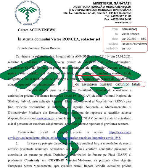În ziua în care a accesat dovezile de pe site-ul Agenției Europene a Medicamentelor, pe 27 ianuarie a.c., ActiveNews s-a adresat Agenției Naționale a Medicamentului a Ministerului Sănătății cu solicitarea de a i se furniza în detaliu reacțiile adverse severe și cazurile fatale raportate în România, după modelul european, respectiv pe vârste, sexe, date etc. Deși comunicarea serviciului de presă a fost promptă și amabilă, Agenția nu a răspuns solicitărilor publicaţiei și i-a trimis pe site-ul creat cu STS unde se raportează zilnic numărul de cazuri – fără detaliile cerute pentru a putea efectua o analiză cu privire la situația din România. Mai mult, răspunsul oficial al instituției Ministerului Sănătății, transmis pe 29 ianuarie, la o zi deci după decesul asistentei medicale de la Institutul Marius Nasta, nega prin omisiune existența vreunui caz de moarte suspectă în urma vaccinului, cu toate că, după cum s-a dovedit prin Comunicatul din 5 februarie, Ministerul avea cunoștință despre moartea asistentei survenită pe 28 ianuarie a.c..