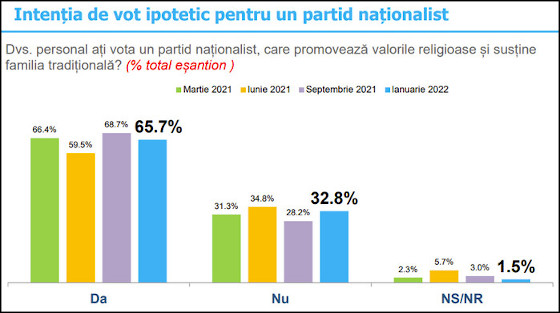 Astfel, 65,7% dintre români ar vota un partid naţionalist, care promovează valorile religioase şi susţine familia tradiţională. Este un procent care practic se menţine de un an de zile. Mai exact, în martie 2021 intenţia de vot pentru un partid naţionalist se situa la 66,4%, în iunie 2021 la 59,5%, iar în septembrie 2021 la 68,7%. De partea cealaltă, 32,8% dintre repondenți au declarat că nu ar acorda votul unei asemenea formaţiuni.