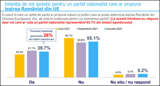 Dintre cei 65,7% care ar vota un partid naţionalist, care promovează valori religioase şi susţine familia tradiţională, doar o minoritate ar dori ieşirea României din Uniunea Europeană. Mai exact, 39,7%. Un procent în scădere faţă de septembrie 2021 (când se situa la 41,1%), dar în creştere faţă de iunie 2021 (când era de 35,3%). În schimb, 51,1% dintre cei care ar vota un partid naţionalist se opun ieşirii României din UE.