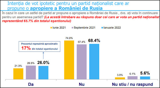Nu în ultimul rând, dintre cei 65,7% care ar vota un partid naţionalist, 68,4% şi-ar modifica opţiunea în cazul în care această formaţiune ar propune o apropiere faţă de Rusia.