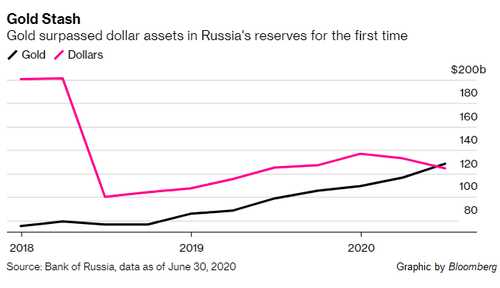 Deținerile de aur din Rusia au eclipsat rezervele în dolari anul trecut, în ciuda întreruperii achizițiilor de aur. Acest fapt s-a datorat parțial unei creșteri a valorii deținerilor de aur datorită creșterii prețului acestui metal, dar și unei funcții a eforturilor continue ale băncii centrale pentru a scăpa de activele în dolari.