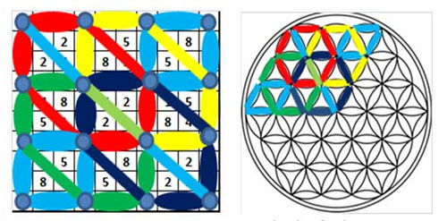The pedals in the Flower of Life are the numbers in the matrix. Note that the numbers not representing pedals represent the fixed signs of the Zodiac and are the reason the first letter of the bible is BETH. There are 18-numbers represented by the 2, 5 and 8. This matrix was originally a 9 x 9 matrix: Kamea of the Moon (18 / 81 = 0.22222222…): PEI and BETH. This goes to the heart of the Genesis Creation Account.