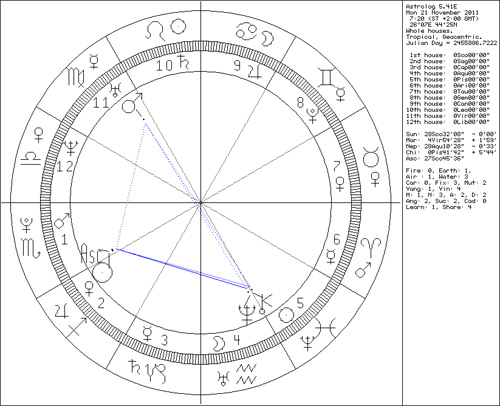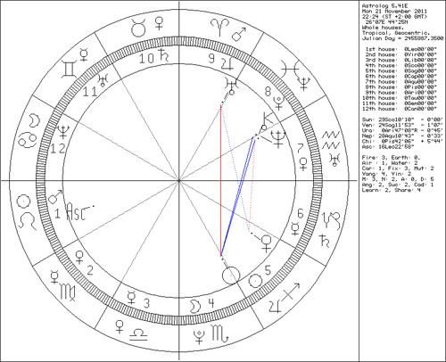 Totodată, în desenul de mai jos, se observă încă o configuraţie astrologică, numită „aripile de pasăre”, pe care o putem vizualiza foarte uşor dacă facem abstracţie de sextilul Venus-Neptun/Chiron şi de opoziţia Jupiter-Saturn. Ea este activă în intervalul 22.11, 00h08 – 25.11.2011, 22h55 (+2h00GMT) ora Romaniei.