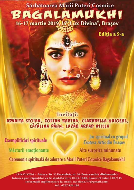 În weekendul 16-17 martie 2019, la Centrul Lux Divina din Brașov va avea loc un eveniment spiritual excepțional: Sărbătoarea Marii Puteri Cosmice BAGALAMUKHI.
