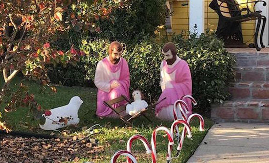 Cameron Esposito, un actor şi activist LGBT din California, SUA, a postat pe pagina proprie de Facebook, care are peste 90.000 de fani, o fotografie cu o scenă a „Nașterii” instalată pe peluza unui vecin, în care, în loc de Iosif și Fecioara Maria, sunt doi bărbați.