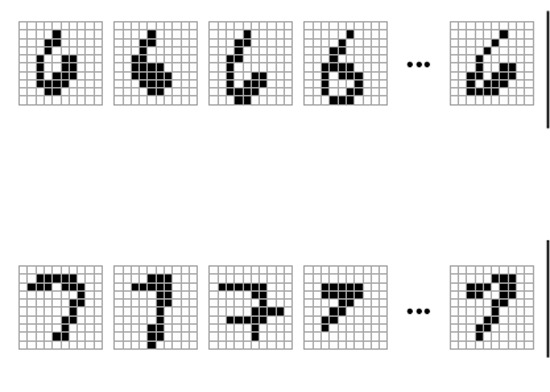 Examples of handwritten sixes and sevens arranged on a 10×10 grid. Each square on the grid is represented by a molecule in a specified concentration.