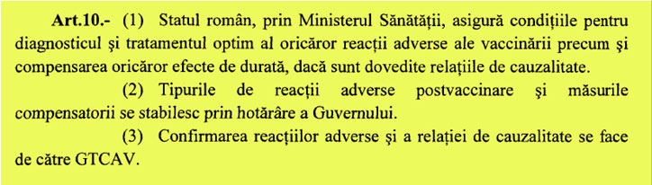 Articolul 10 al proiectului de lege abordează problema reacțiilor adverse ale vaccinării.
