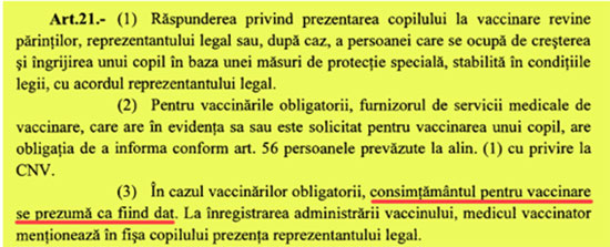 Art. 21 (3) din proiectul de lege a vaccinării prevede că „în cazul vaccinărilor obligatorii consimţământul se prezumă ca fiind dat”.