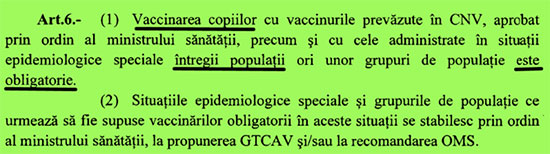 În art. 6 se precizează că nu numai vaccinarea copiilor, ci și vaccinarea întregii populații este obligatorie în situații epidemiologice speciale, situații care vor fi stabilite prin ordin al ministrului sănătății.