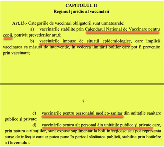 Art. 13 precizează categoriile de populație pentru care vaccinarea va fi obligatorie. În afară de copii, există mai multe categorii de adulți care vor fi vaccinați obligatoriu. Personalul medico-sanitar este prima categorie de acest fel. Urmează „alt personal din unități publice sau private care prin natura atribuțiilor sunt expuse suplimentar la boli infecțioase”. Acest „alt personal” nu este precizat în proiectul de lege, va fi stabilit prin hotărâre a Guvernului. Aici este foarte posibil să fie incluse toate persoanele care își desfășoară activitatea în colectivități, cum sunt profesorii, educatorii, asistenții sociali, dar și persoanele care lucrează cu publicul în general: lucrătorii din comerț, funcționarii publici în general, inclusiv membrii Parlamentului și angajații ministerelor. În afară de toate categoriile de mai sus, în situații epidemiologice speciale, stabilite prin ordin al ministrului Sănătății, întreaga populație va fi vaccinată obligatoriu.