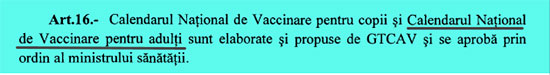 În art. 16 al proiectului de lege se menționează în premieră un Calendar de Vaccinare pentru Adulți care va fi elaborat de către Grupul Tehnic de Coordonare a Activităților de Vaccinare, o comisie ce urmează a fi înființată prin acest proiect de lege. În mod foarte probabil, odată legea aprobată și obligativitatea instituită, calendarele de vaccinare pentru copii și adulți vor putea fi modificate cu ușurință, în sensul adăugării continue de noi vaccinuri obligatorii.