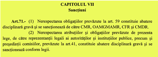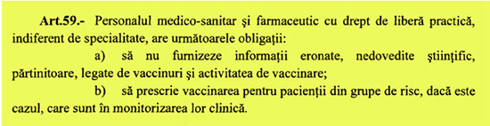 La art. 59 din proiectul de lege găsim precizarea că „personalul medico-sanitar și farmaceutic, indiferent de specialitate” are obligația „să nu furnizeze informații eronate, nedovedite științific, părtinitoare, legate de vaccinuri și activitatea de vaccinare” și mai mult de atât, la art. 71 vedem că nerespectarea prevederilor art. 59 „constituie abatere disciplinară gravă” care se sancționează de către Colegiul Medicilor din România, Ordinul Asistenților Medicali Generaliști, Moașelor și Asistenților Medicali din România, Colegiul Farmaciștilor din România și Colegiul Medicilor Dentiști din România.
