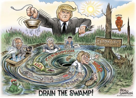 În vara anului 2017, Trump a început să „dreneze mlaștina” și i-a luat șase luni pentru a aduce puterile mondiale sub controlul său. Planul era atunci să-i demaşte pe cei mai malefici oameni de pe Pământ, CEO de mari corporații, bancheri, politicieni, care ,,se mișcau” în cercuri închise de crime, corupție și pedofilie.