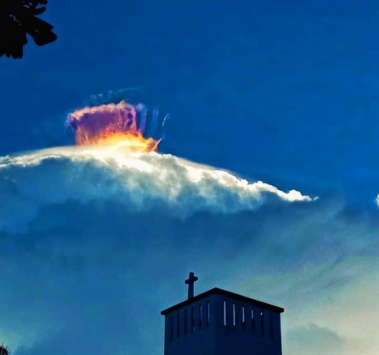 Există multe teorii despre ceea ce ar fi cauzat formația luminoasă, inclusiv extratereștrii… Cu toate acestea, experții au spus că imaginea uimitoare a fost provocată de un fenomen meteorologic rar numit „irizarea norilor”, care se produce atunci când lumina soarelui este refractată de picăturile de apă și cristalele de gheață din nor.