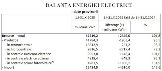 „Simplu și clar: pe primele 10 luni din 2025 producția de energie electrică a scăzut cu 4,5%, iar importul a crescut cu 42,6%!