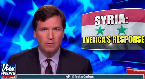 « Tous les génies qui nous disent que [Bachar] el-Assad a tué ces enfants, en sont-ils vraiment sûrs ? Evidemment ils n’en n’ont aucune idée. Ils inventent. Ils n’ont aucune idée de ce qu’il s’est vraiment passé », a-t-il attaqué en ouverture de son émission le 9 avril https://video.foxnews.com/v/5767243543001/#sp=show-clips , en référence aux incessants et unanimes appels des médias à intervenir en Syrie à la suite d’une supposée attaque chimique dans la Ghouta orientale, attribuée sans s’embarrasser d’une enquête au gouvernement syrien.