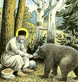 Îl mai vizitau doar păsările şi animalele sălbatice. Acestea veneau la miezul nopţii şi aşteptau ca el să-şi termine rugăciunea, după care le hrănea cu pâine. Maica stareţă a Mănăstirii Diveevo, Matrona Plescheeva, care l-a văzut hrănind un urs, povestea: „Faţa marelui părinte era minunat de luminoasă şi veselă având o strălucire îngerească.” Un alt martor, Părintele Alexandru, l-a întrebat o dată cum se face că acea puţină pâine care se află în traista sa poate hrăni atâtea animale. „Întotdeauna se găseşte destulă pâine în traistă.” i-a răspuns liniştit Părintele Serafim.