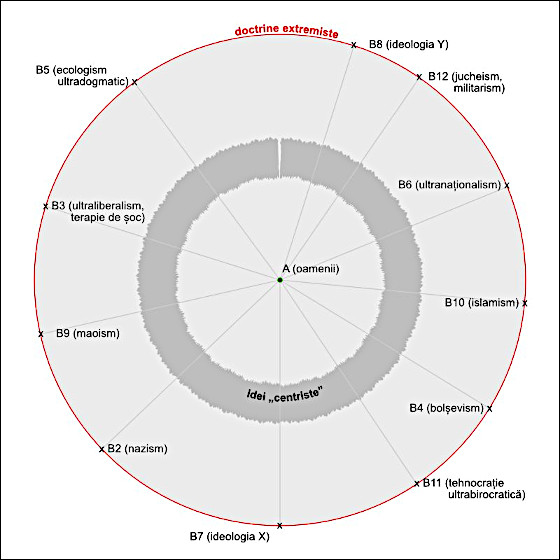 Ca să diferențiem, totuși, între diversele tipuri de „extremisme”, putem reprezenta pct. B sub forma unui loc geometric, adică un cerc. În schița de mai jos, special nu am respectat convenția „stânga/dreapta”, pentru că de fapt ea e desuetă: post-modernitatea ne-a demonstrat că extremele de tot felul, indiferent de culoarea lor politică, conduc către una și aceeași idee. Să ignori oamenii, chiar și cu prețul uciderii lor, și să pui deasupra vieții lor ideologiile.