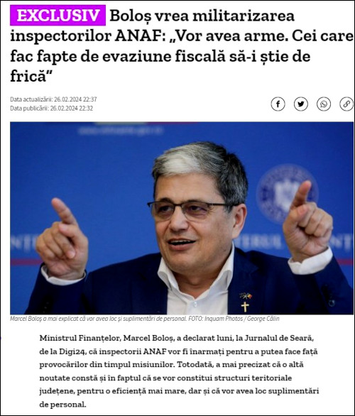 Știre: „Boloș vrea militarizarea inspectorilor ANAF: Vor avea arme. Cei care fac fapte de evaziune fiscală să-i știe de frică
