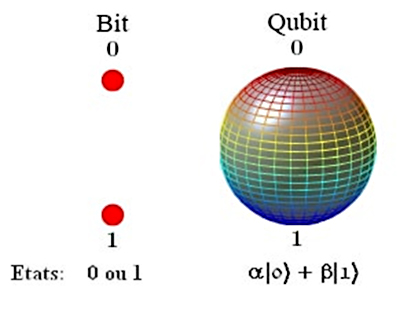 À gauche, un bit classique dont la valeur est soit 0 soit 1. À droite, un qubit à la structure multidimensionnelle pouvant prendre simultanément 0 et 1 comme valeurs.