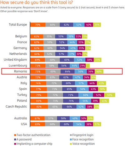 Unul din trei români consideră că implantarea unui chip ar fi o metodă foarte sigură de autentificare atunci când vine vorba să-ți accesezi contul bancar de pe telefonul mobil, dar cei mai mulți ar prefera autentificarea în doi pași, arată datele unui sondaj online recent publicat. Cei mai favorabili securizării prin implant sunt turcii (peste jumătate), iar cei mai reticenți sunt luxemburghezii (29%).