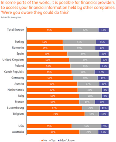 În curând va intra în vigoare și noua Directivă privind serviciile de plăți a Uniunii Europene (PSD2) care va permite schimbul de date financiare cu permisiunea consumatorilor, dar puțini europeni (32%) sunt conștienți de acest serviciu. În timp ce unele țări manifestă un entuziasm relativ, cum ar fi Germania (unde 61% dintre cei care au auzit despre acest serviciu spun că le place ideea), altora nu le place. De exemplu, 63% dintre olandezii care au auzit despre asta spun că nu ar dori ca datele lor să fie partajate. În privința României, concetățenii noștri și-ar da acceptul în proporție de 54%.