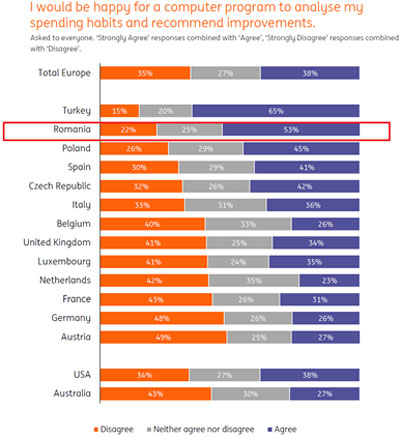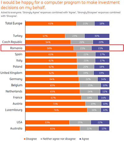 Există apoi o reticență în a lăsa pe mâna Inteligenței Artificiale deciziile financiare pe un computer, deși oamenii sunt mai deschiși la faptul ca un soft să le analizeze obiceiurile privind cheltuielile și să le recomande îmbunătățiri. Doar unul din 5 români ar accepta „automatizarea” deciziilor lor financiare, în timp ce la nivelul UE circa 61% dintre europeni spun că nu s-ar simți deloc confortabil ca un program informatic să ia decizii investiționale în numele lor.