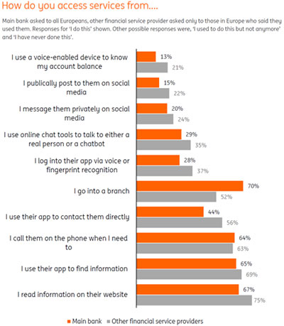 Aproximativ 49% dintre europeni și 48% dintre americani spun că nu folosesc niciun alt furnizor de servicii financiare decât propria bancă cu care lucrează. Restul (diferența până la 100%) folosesc mai mulți furnizori-bănci diferite, aplicații de pe telefon sau servicii online prin care fac transferuri internaționale, „share”-uirea de bani cu prietenii șamd. Există, de asemenea, o diferență mare între țări.