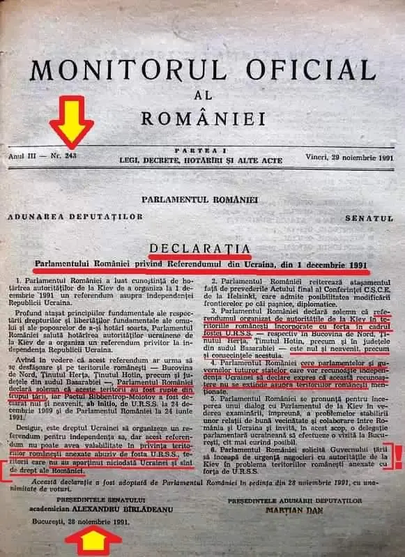 Public mai jos un facsimil, un document extrem de important, preluat din Monitorul Oficial al României. Este o declarație solemnă a parlamentului nostru privind referendumurile organizate de Kiev în 1990 în Bucovina de Nord, Ținutul Herța, Ținutul Hotin, precum și în regiunile din sudul Basarabiei. Aceste referendumuri au fost inițiate de guvernul Ucrainei și au avut drept obiectiv să bată în cuie, invocându-se, vezi Doamne, voința populației, statutul unor provincii ocupate cu forța de Uniunea Sovietică, iar apoi, într-o anumită conjunctură istorică, integrate în teritoriul Republicii Socialiste Ucrainene.