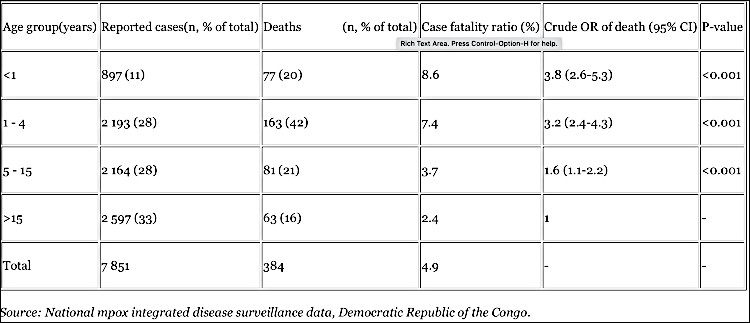 • Copiii continuă să reprezinte grupa de vârstă cea mai afectată (Tabelul 1); din cele 7851 de cazuri de mpox raportate, 39% au fost raportate la copii cu vârsta sub 5 ani (n=3090),