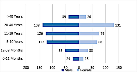Figura 3. Distribuția pe grupe de vârstă și sex a cazurilor confirmate de mpox, Republica Democratică Congo, 1 ianuarie – 26 mai 2024 (n=852*)