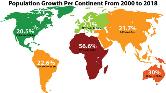 Prin comparație, populația Africii a crescut cu 56,6%, adică cu peste 400 de milioane. Deci cu mai mult de jumătate din populația Europei!