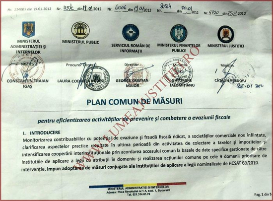 Planul comun de măsuri pentru eficientizarea activităţilor de prevenire şi combatere a evaziunii fiscale a fost încheiat în baza Hotărârii CSAT nr. 69/2010, şi semnat în ianuarie 2012 de următorii:
