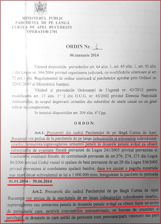 „Art. 1 – Procurorii din cadrul Parchetului de pe lângă Curtea de Apel Bucureşti vor prelua de la parchetele de pe lângă judecătoriile şi tribunalele subordonate ierarhic urmărirea/supravegherea urmăririi penale în dosarele penale având ca obiect infracţiunile de evaziune fiscală… dacă s-a cauzat o pagubă materială mai mare decât echivalentul în lei a 1.000.000 euro… înregistrate la parchete în perioada 01.01.2014 – 30.06.2014;