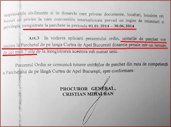 Art. 2 – Procurorii din cadrul Parchetului de pe lângă Curtea de Apel Bucureşti vor prelua de la parchetele de pe lângă judecătoriile subordonate ierarhic urmărirea/supravegherea urmăririi penale în dosarele penale având ca obiect fapte săvârşite de persoanele care, potrivit convenţiilor internaţionale, se bucură de imunităţi şi privilegii… înregistrate la parchete în perioada 01.01.2014 – 30.06.2014;