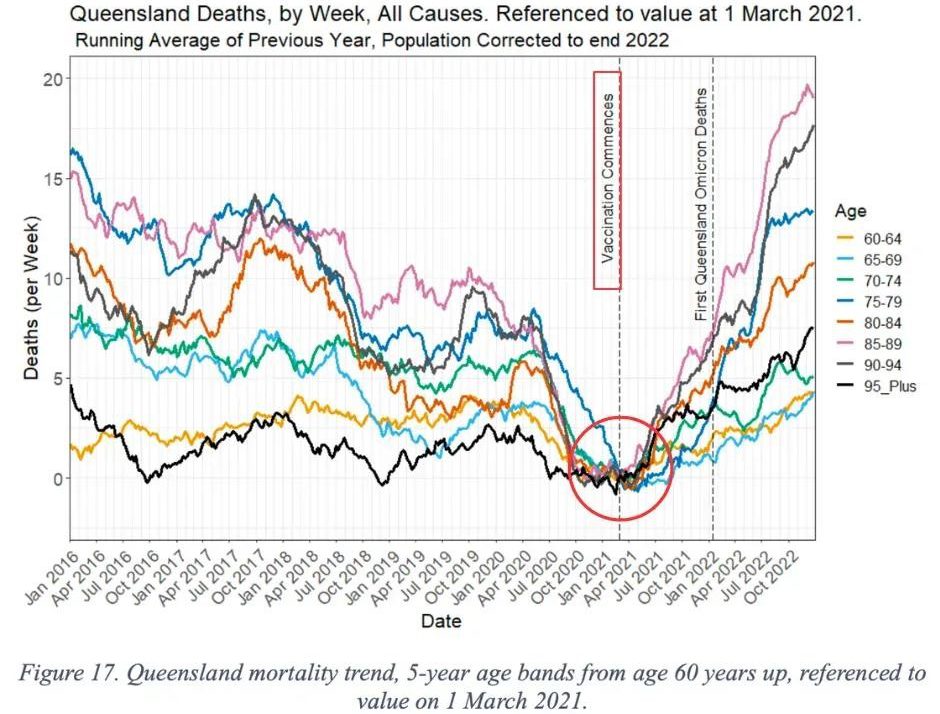 O analiză aprofundată a datelor despre mortalitatea din Queensland, efectuată de Andrew Madry, a descoperit că rata mortalității din orice cauză a început să crească odată cu introducerea vaccinului anti-covid, cu nouă luni înainte ca granițele să se deschidă și să apară primele decese de covid, cu infecții la nivel local. Madry prezintă tehnici algoritmice care ar fi putut detecta această schimbare de tendință în timp real și ar fi putut permite guvernului să își dea seama că ceva nu este în regulă și să ajusteze politicile.