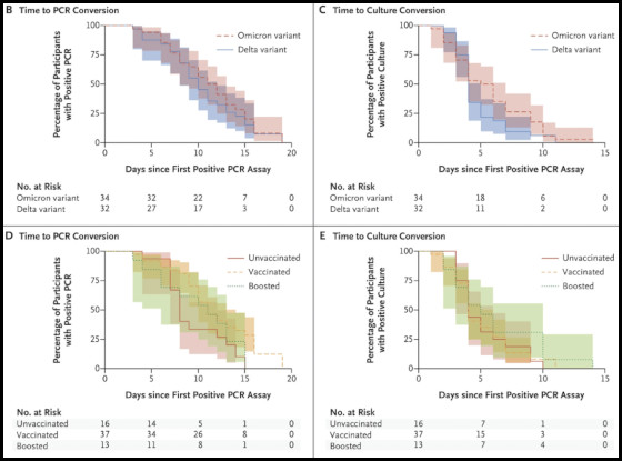 Atunci când au fost împărțite în categoriile „nevaccinați”, „vaccinați” și „cei care au primit rapel”, datele au arătat că persoanele care nu au primit un vaccin anti-covid-19 au fost contagioase pentru o perioadă mai scurtă de timp.
