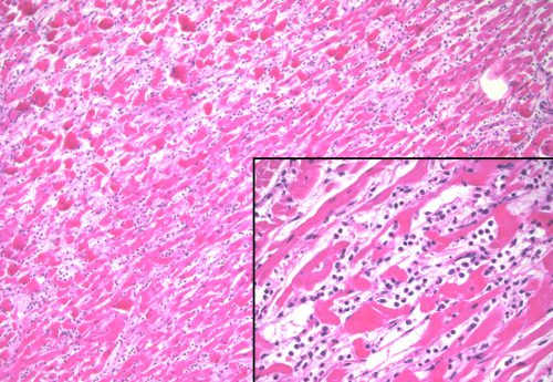 Miocardita este o boală inflamatorie a miocardului, care poate apărea izolat sau ca parte a unor tulburări multiorganice / sistemice mediate imun sau ca reacții la substanțe exogene / endogene.[13] Etiologiile sunt variate și includ cauze infecțioase și neinfecțioase. Printre cauzele neinfecțioase sunt cauze imune / autoimune (autoantigene, asociere cu boli mediate imun, aloantigeni și alergeni), medicamente / substanțe toxice (de exemplu, hipersensibilitate sau efecte toxice directe) și alte cauze (de exemplu, radiații, înțepături de insecte, mușcături de șarpe).[13] Miocardita limfocitară este cel mai frecvent subtip histologic, caracterizat printr-un infiltrat miocardic inflamator cuprinzând de obicei celule mononucleare. În faza acută / activă, este de obicei însoțit de afectarea / necroza miocitelor.[13] Deși criteriile evoluează, criteriile Dallas impun „infiltrate inflamatorii ale miocardului cu necroza și/sau degenerarea miocitelor adiacente, ceea ce nu este tipic pentru afectarea ischemică asociată cu boala arterială coronariană.”[14-16]