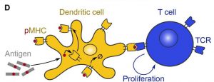 Imaginea de mai jos prezintă o celulă dendritică (APC), activând o celulă T prin prezentarea către aceasta a unui antigen, a unei substanțe toxice sau străine.