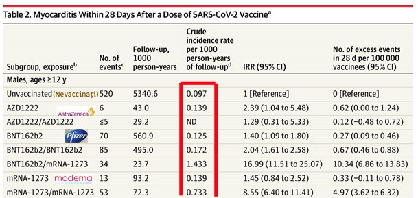 Pentru Pfizer, se ajunge la incidențe cuprinse între 38,8 și 240 la suta de mii. (De 9 ori mai mult.) În fine, Moderna (ultimele două intrări din tabel) crește și ea incidența celor două afecțiuni la valori între 32,2 și 128,7 la suta de mii. (Adică de aproape 5 ori pentru cel mai nociv produs al său.)