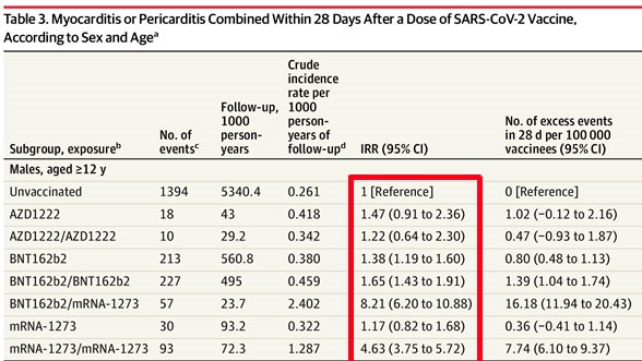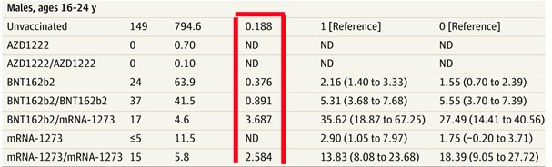 Coloana evidențiată cu roșu ne arată creșterile incidenței miocarditei la toți participanții masculini din studiu (peste 12 ani). Constatăm următoarele: